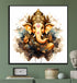 A serene and majestic sculpture of Lord Ganesha is presented, seated regally on an ornate throne. He is depicted in a brilliant white and adorned with golden jewelry, while the lower half of the figure and the base of the throne are surrounded by a dynamic watercolor splash of warm and cool tones. The artwork offers a beautiful fusion of traditional divine imagery with a modern, artistic flair.