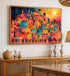 Imagine a city alive with a breathtaking mix of color and life. This painting captures a bustling cityscape with domes and towers painted in brilliant shades of pink, orange, and blue. People gather on rooftops and stroll through the streets, bathed in the warm light of a setting sun or a glowing moon. It’s a joyful and energetic piece that feels like a festival, full of rich detail and celebration. This artwork is a perfect way to add a powerful pop of color, culture, and happy energy to any room, making it an instant focal point.