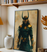 Gaze upon the captivating presence of Loki, the God of Mischief, in this striking artwork. Clad in his iconic horned helmet and intricate armor, his intense gaze and powerful posture command attention. The dynamic brushstrokes and rich palette of greens, gold, and earthy tones create a dramatic and artistic portrayal of this beloved figure. A compelling piece for fans of mythology and those who appreciate art with a commanding allure.