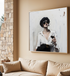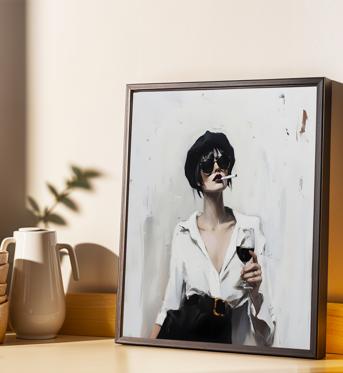 This captivating portrait exudes a sense of modern, edgy elegance. The subject, a woman with a sleek bob and dark sunglasses, is dressed in a crisp white shirt and a high-waisted black skirt. The artwork uses a rich, textured style with bold brushstrokes and a muted background, giving it a raw yet sophisticated feel. This piece is perfect for anyone looking to add a touch of confident, artistic flair to their living room, study, or home bar. It’s an ideal way to bring a sense of mystery and style to your space.