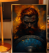 A dynamic and intense portrait of a red-bearded warrior is presented, with a determined gaze. His face is partially obscured by a round, blue shield, and the background is a fiery abstract of orange and red, suggesting a dramatic battle. The artist's use of bold, expressive brushstrokes gives the piece a raw and visceral energy. This work of art honors the strength of the warrior and evokes a feeling of fierce determination and courage.