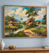 Step onto a sun-drenched path and discover a world of peaceful beauty. This artwork captures a warm, inviting village scene with charming homes nestled among lush green trees and bright yellow flowers. A small stream meanders through the landscape, adding to the feeling of natural comfort. The brilliant blue sky filled with soft, puffy clouds promises a perfect day. A wonderful addition to any home, it brings a sense of simple joy and relaxation, offering a constant reminder of the easy-going beauty found in a quiet country life.
