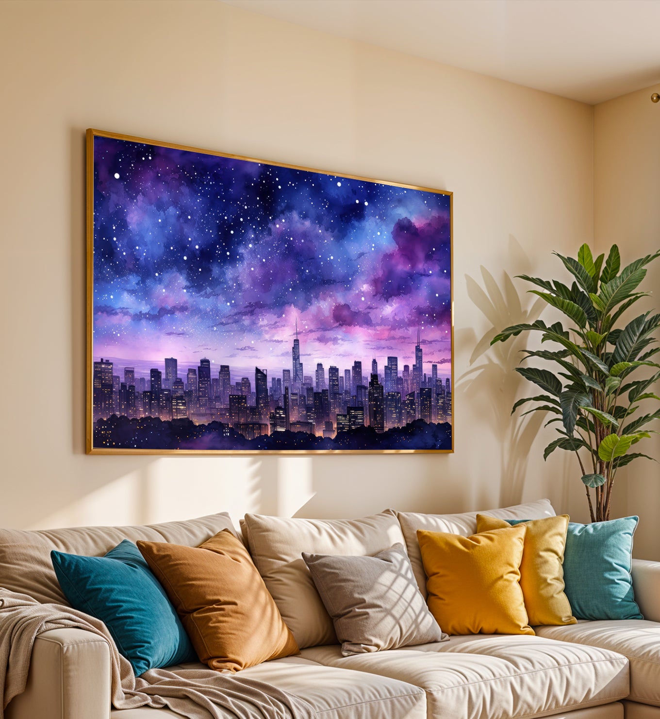 Look up at a city skyline unlike any you've ever seen. This painting captures the familiar glow of urban life under a spectacular night sky, where bright stars and swirling clouds of purple and blue create a feeling of pure magic. The warm city lights reflect a sense of busy energy, while the dramatic cosmic background invites you to get lost in a world of dreams. It’s an imaginative and captivating piece that beautifully blends the excitement of the city with the infinite wonder of the universe. This art is perfect for anyone who wants a unique and inspiring view to brighten their home.