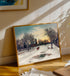This painting shows a horse-drawn sleigh on a snowy road in a peaceful village. A glowing church stands in the middle of the scene, with people walking nearby. The sky is a soft mix of pink, orange, and blue, and a crescent moon hangs over the scene. The whole picture has a timeless and heartwarming holiday feeling.