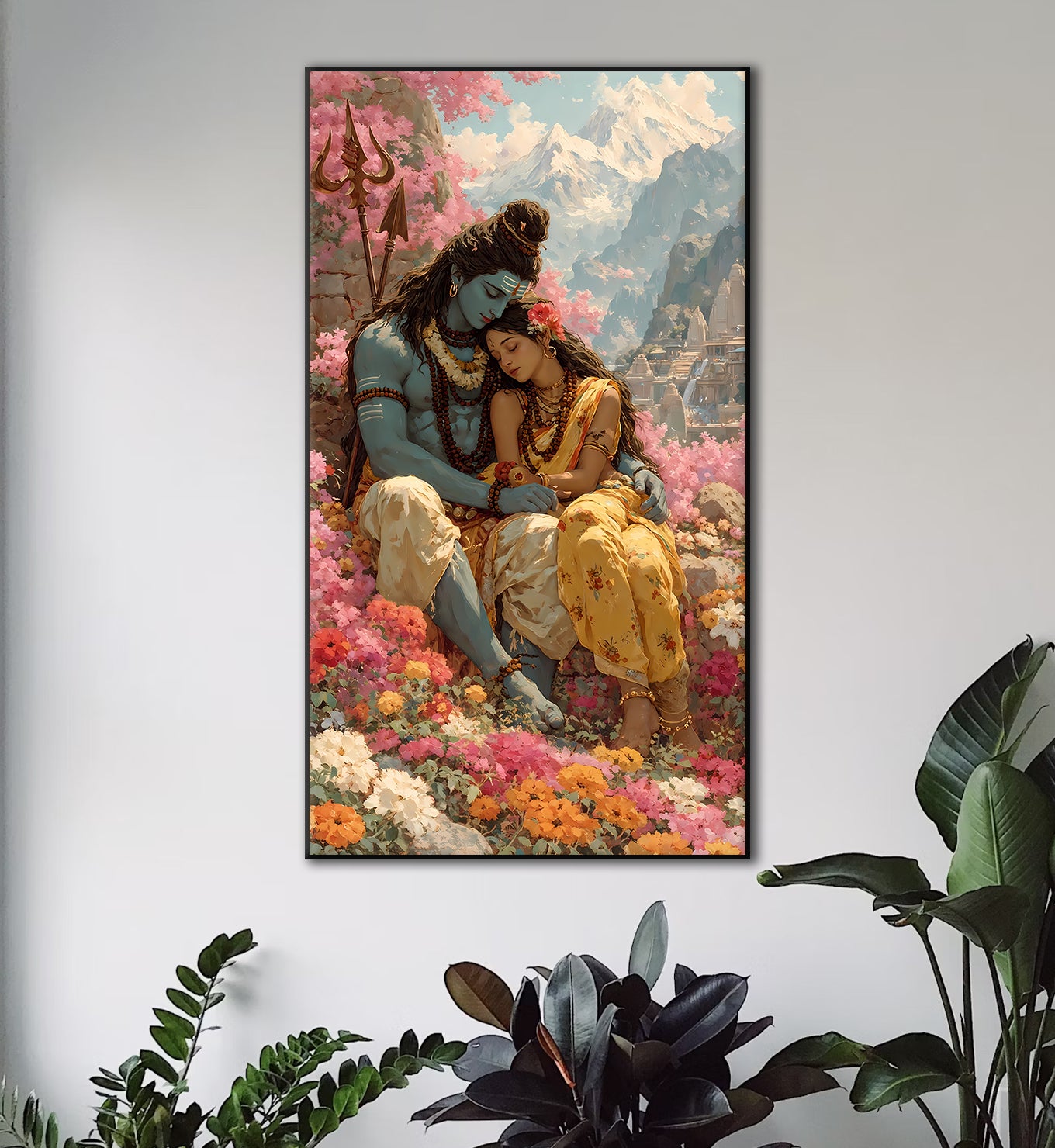 Immerse yourself in the serene beauty of divine love with this captivating artwork. Lord Shiva and Parvati are depicted in a tender embrace amidst a vibrant cascade of blossoms, with majestic mountains in the background. This piece beautifully conveys profound peace, eternal devotion, and the sacred harmony of their union, bringing an aura of tranquility and spiritual grace to any space.