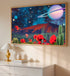 Explore a fantastical dreamscape where the cosmic meets the desert with this stunning artwork. Under a brilliant, star-studded sky, a majestic ringed planet hangs above rolling red mountains and a vibrant field of blooming cacti and fiery red poppies. This unique piece transports you to an otherworldly paradise, blending the wonders of space with earthly beauty. It's an unforgettable statement for those who dare to dream beyond the ordinary.