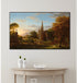 This magnificent landscape by Thomas Cole, a master of the Hudson River School, depicts a peaceful homecoming at sunset. A grand Gothic cathedral dominates the scene, framed by lush trees and distant mountains, as figures on horseback and a pack horse arrive on the grounds.