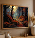 Journey into a magical and mysterious world with this captivating artwork. The deep, rich colors and glowing light create an otherworldly feeling, while the twisting trees and rustic path invite you to explore. This piece is perfect for adding a sense of wonder and drama to your space, making any room feel more intriguing and alive with a touch of nature's magic.