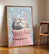 This sweet painting captures a moment of pure bliss. A fluffy gray kitten, snug in a warm pink sweater, closes its eyes with a blissful smile, feeling the gentle touch of falling snowflakes. The soft, wintery background creates a serene and peaceful mood, highlighting the kitten's happy expression. It's an image that reminds you of simple pleasures and cozy, joyful moments. This delightful artwork is perfect for adding a sense of warmth, charm, and cheer to any room.