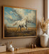 Feel the raw power and incredible grace of a wild horse running free. This painting captures a magnificent white horse in full gallop, its long, flowing mane and tail swept back in the wind. The horse is a stunning vision against a vast, open field of golden grass and a dramatic sky filled with light and shadow. The artwork feels alive with movement and a sense of pure freedom. It's a truly beautiful and inspiring piece that will bring the untamed spirit of nature and a touch of grand adventure to your home.