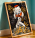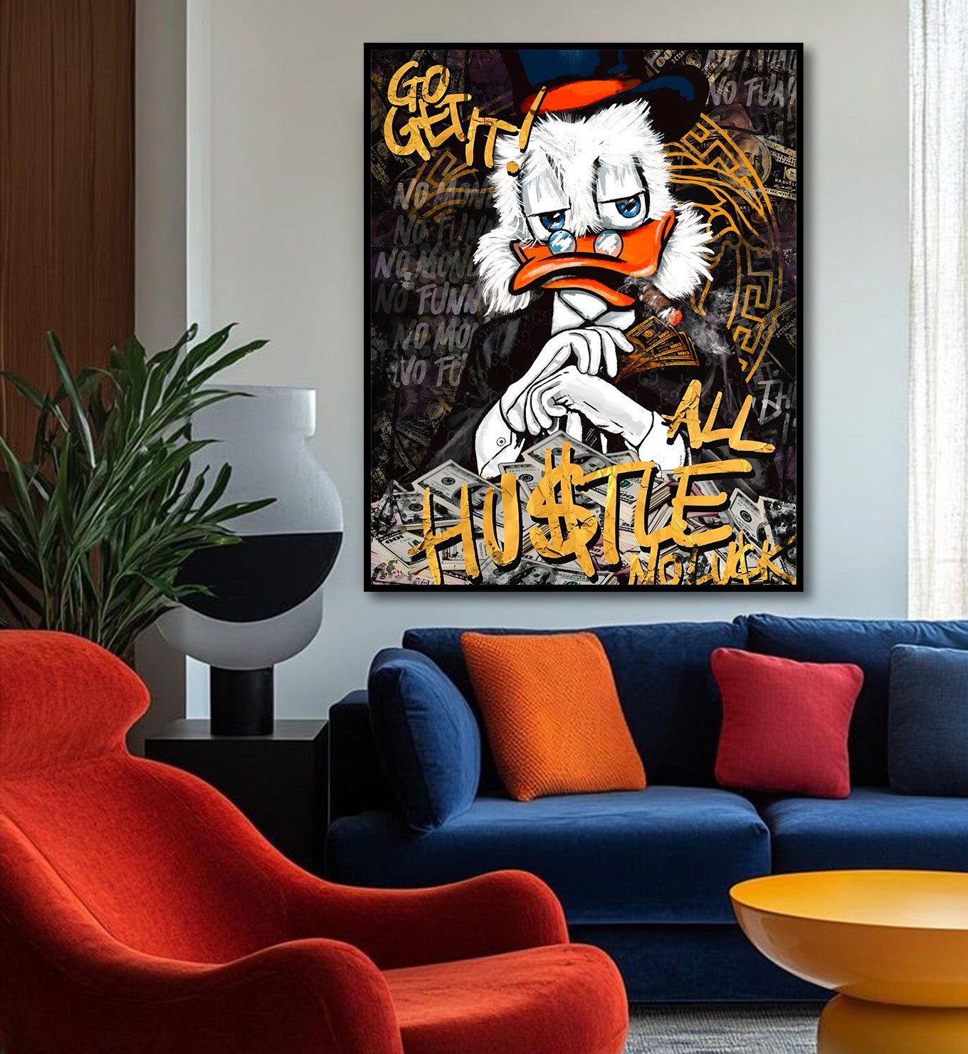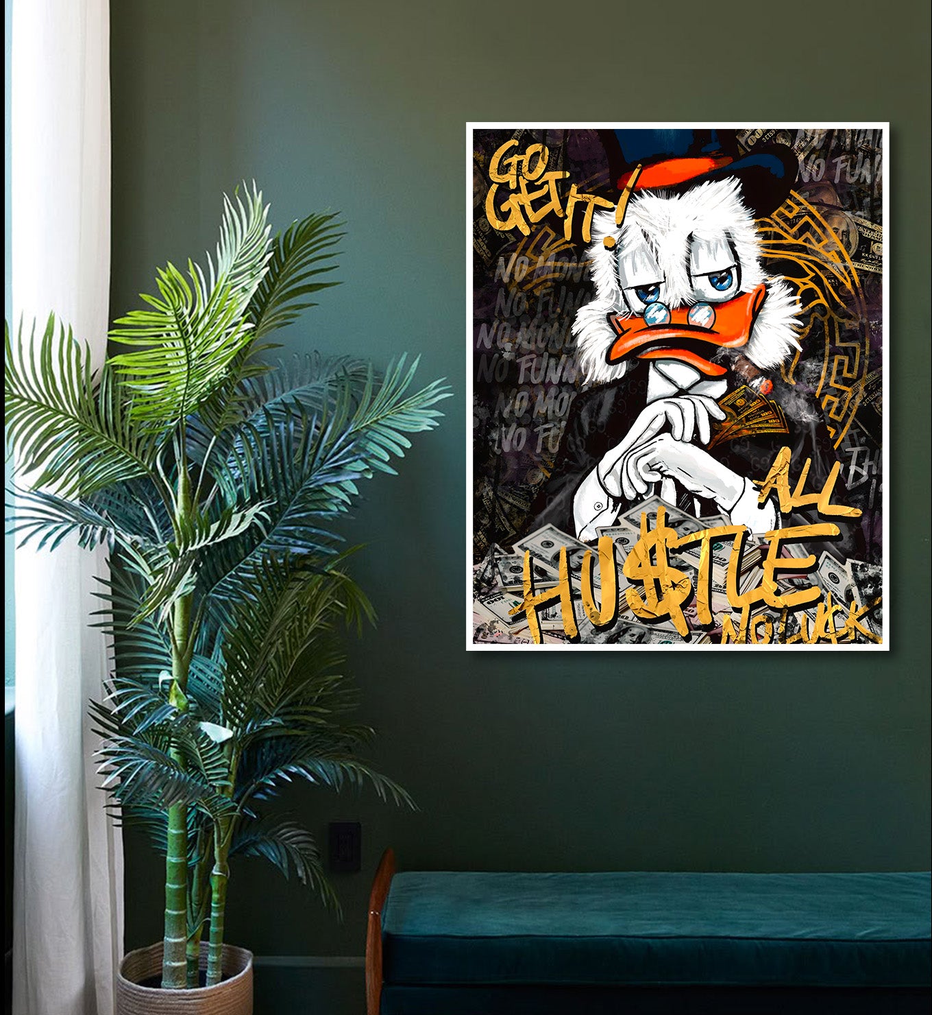 This powerful piece captures the raw essence of true ambition. Scrooge McDuck, the ultimate symbol of wealth, is depicted not in his usual boisterous manner, but with a gaze that speaks volumes about the journey to the top. His expression, coupled with the "HUSTLE ALL DAY" message boldly emblazoned across the foreground, tells a story of relentless drive and the sacrifices made for success.