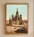 A beautiful vintage illustration of St. Basil's Cathedral, showcasing its iconic colorful domes and intricate architecture. A horse-drawn carriage adds a touch of historical charm to the bustling city square. The muted colors and detailed linework give the piece a nostalgic, old-world feel.