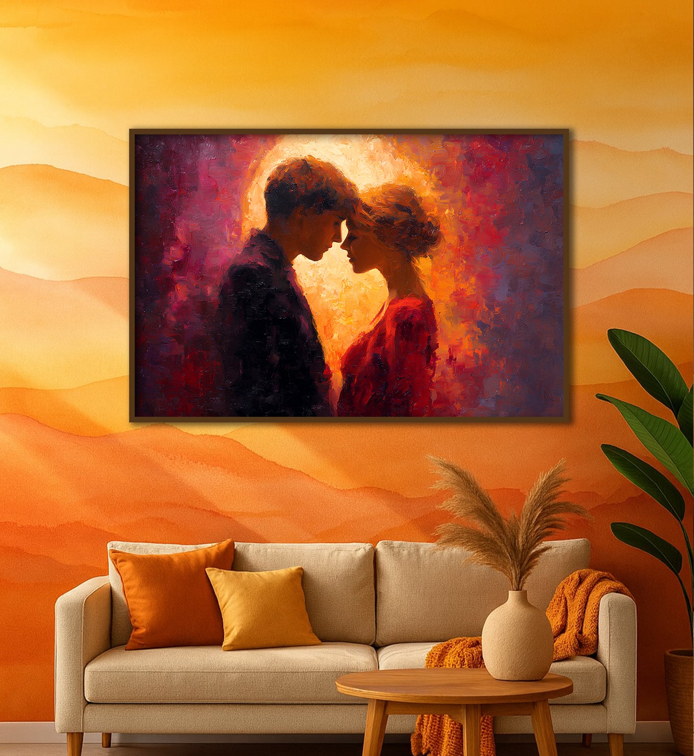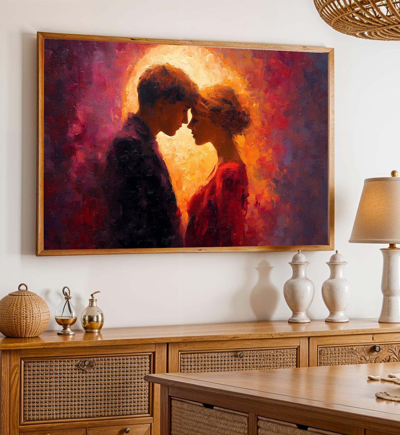 An impressionist-style portrait captures a moment of pure, heartfelt intimacy between two people. The figures are bathed in a radiant, golden light, symbolizing a deep and powerful connection. The thick, visible brushstrokes add a beautiful, emotional texture to the piece. This artwork is more than just a picture; it’s a feeling—a visual representation of love and closeness. It's a perfect way to add a touch of romance, warmth, and artistic beauty to any space.
