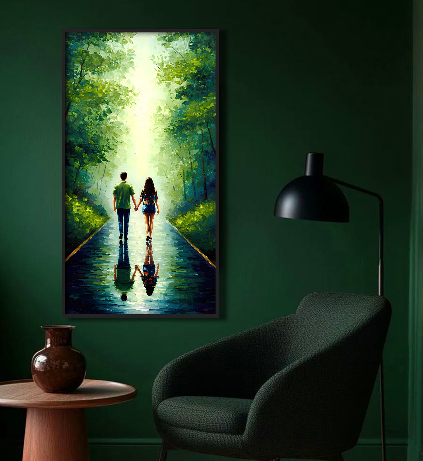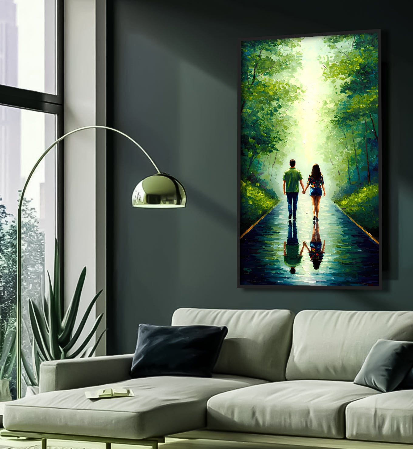 A loving couple walks hand-in-hand down a sunlit path, their figures reflected perfectly in the wet pavement below. They are surrounded by a lush, green canopy of trees that filters the bright light, creating a sense of peace and optimism. The overall feeling is one of shared direction and a deep, quiet connection. This artwork captures the beautiful simplicity of a shared journey. It's an emotionally resonant piece that would be a wonderful gift for a loved one or a heartfelt addition to any home, symbolizing love, hope, and companionship.