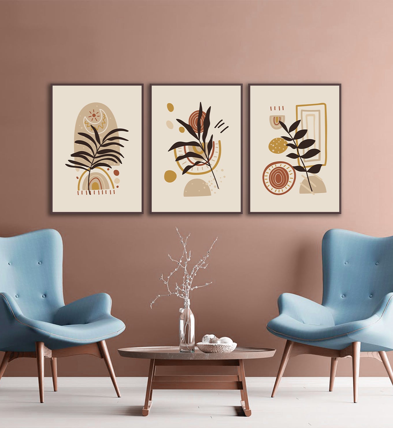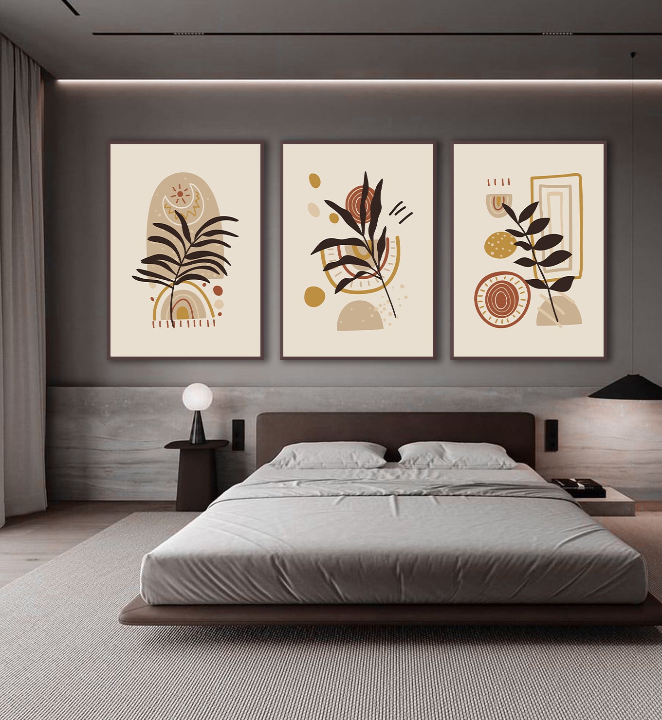 This appealing three-piece art arrangement beautifully merges organic elements with abstract shapes. Each panel showcases stylized plant motifs intertwining with subtle geometric forms, rendered in a soothing palette of warm neutrals and deep browns. This creates a grounded yet artistic aesthetic. A sophisticated accent, this collection brings a contemporary, calming essence to any environment, celebrating nature's elegant designs.