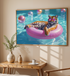 This vibrant artwork captures the ultimate picture of relaxation! A majestic tiger is enjoying a cool dip, comfortably lounging on a bright pink inflatable ring in a sparkling blue pool. This piece instantly brings a feeling of vacation, fun, and laid-back luxury. It's perfect for adding a splash of personality to a living room, a pool house, or any space that needs a pop of color and a reminder to relax and enjoy life. Bring the good times home with this unique and cheerful artwork!