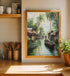 Imagine yourself gliding through this peaceful scene, where a single, elegant boat rests silently on a calm, shimmering waterway. On either side, rustic wooden homes stand tall on stilts, shaded by towering palm trees that reach towards a soft, cloudy sky. The rich greens of the plants and the reflective water create a wonderfully soothing atmosphere. This artwork captures a moment of pure tranquility and a glimpse into a serene way of life. It's an ideal piece to bring a feeling of calm, natural beauty, and a touch of exotic charm to any room in your home.