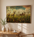 This beautiful painting shows a group of deer standing together in a field of colorful flowers and tall grass. The sky is full of big, dramatic clouds in shades of blue and orange, and birds are flying overhead, giving the scene a lot of life. Each deer has a unique look, from their different antlers to their varied coats. This piece is perfect for anyone who loves nature and wants to bring a sense of community, peace, and natural beauty into their home.