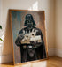 An unexpected and humorous twist on a classic villain, this painting captures Darth Vader in a mundane, yet universally relatable moment. The iconic helmet and menacing cape are paired with a precious bundle of toilet paper, making for a playful contrast between the epic and the everyday. The artist uses a classic painting style to create a funny and unique piece of pop culture art.
