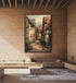 Take a stroll back in time down this enchanting, narrow lane. Weathered structures with rustic rooftops lean towards each other, sharing tales of centuries gone by. A welcoming glow from a window and a wisp of smoke from a chimney hint at the simple domestic life inside. This nostalgic tableau is like a portal to another era, ready to lend an abiding sense of history and old-world charm to your den or family room.