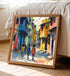 Step into a vibrant scene of a bustling village street, alive with color and the simple joy of childhood. Three children walk together, hand in hand, their bright clothes a joyful contrast to the lively buildings around them. The artwork is full of energetic color and a fluid, watercolor style that gives the entire scene a sense of light and movement. It’s an uplifting and heartfelt piece that captures the feeling of community, innocence, and shared moments. This painting is a perfect way to add a pop of color and a touch of genuine warmth to any room.