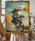 This charming image shows a fluffy cat in a straw hat riding a bicycle down a path. The cat has a serious look on its face, as if on a very important mission, with yellow autumn leaves swirling all around. This fun and imaginative piece makes for a perfect, whimsical addition to any room.