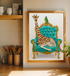 A whimsical scene unfolds with a majestic giraffe and a colorful parrot relaxing on an opulent, turquoise armchair. The artwork combines the wild beauty of nature with the refined elegance of classic furniture, creating a surreal and delightful image. It's a charming conversation starter that will add a touch of playful sophistication and unexpected joy to any room.
