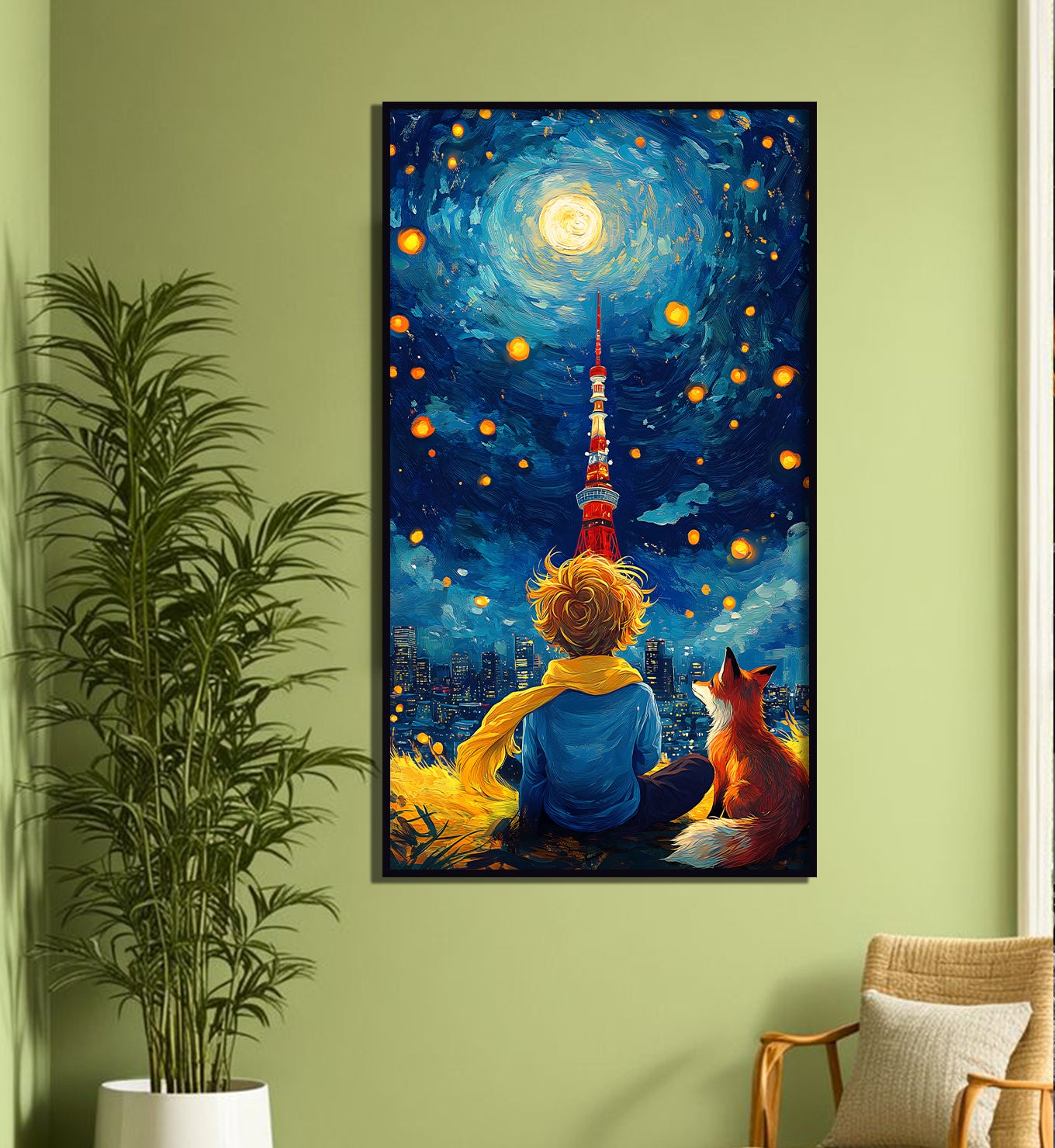 Rediscover a timeless tale of friendship and wonder, set against a magical city skyline. This enchanting artwork brings two of literature's most cherished companions to a new landscape, where they sit together and ponder the bright lights of a modern metropolis. The night sky swirls with painterly motion and glowing orbs, a beautiful homage to a classic artist's vision. It’s a heartwarming scene that reminds us of the importance of connection and seeing the world with your heart. This is a truly special piece for anyone who holds this story dear, a lovely addition that will fill any room with a sense of peace, nostalgia, and gentle magic.