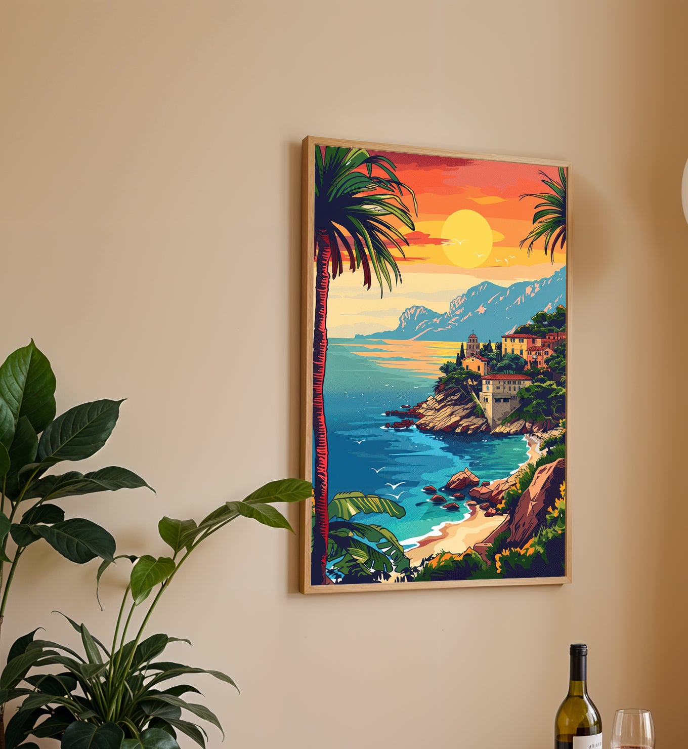 Feel the warmth of a stunning sunset over a breathtaking coastal village. This painting showcases vibrant palm trees framing a picturesque scene of colorful homes perched on cliffs overlooking a sparkling blue sea. The sun dips low, casting a brilliant orange and yellow glow across the sky and reflecting beautifully on the water below. It’s a truly inviting artwork that captures the magic of a perfect evening in a serene, exotic location. This piece is ideal for bringing a sense of warmth, beauty, and vacation vibes into any room, making every day feel like a getaway.