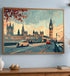 Step into a beautiful, nostalgic moment in London. The famous Big Ben tower and the Houses of Parliament stand as grand backdrops to a bustling street scene, complete with classic cars and the iconic red bus. The painting has a soft, glowing feel, with warm oranges and muted blues that capture the unique atmosphere of a cool day in the city. It’s an elegant and timeless piece that perfectly blends history with a sense of gentle movement. This artwork is a lovely way to add a touch of classic British charm and quiet sophistication to your home.